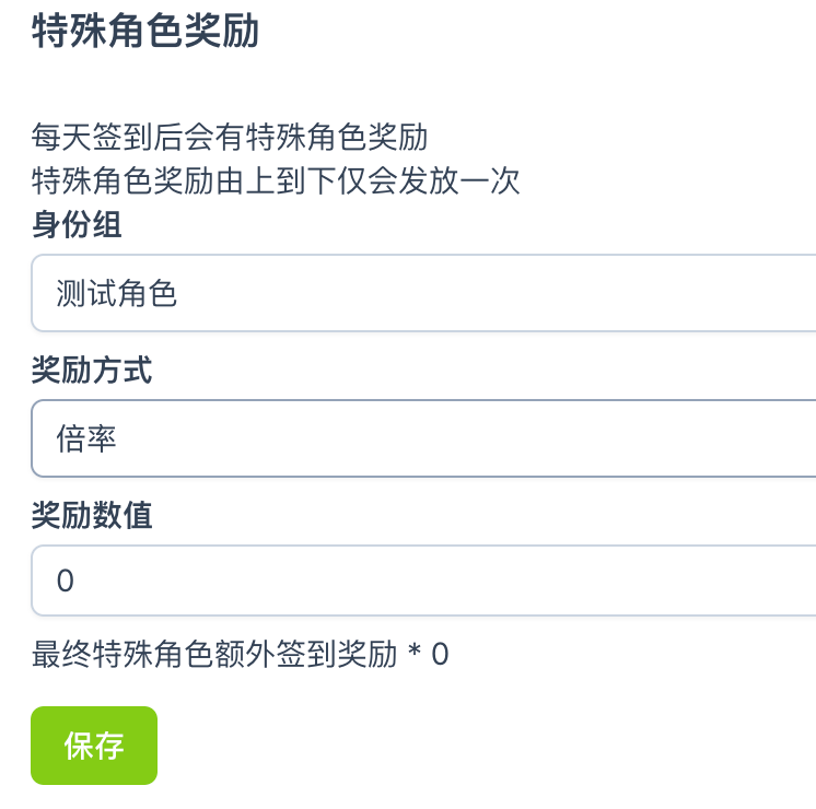 当一个用户有多个特殊角色时,系统只会按服务器设置的奖励角色列表由上而下发放奖励。奖励只会发放一次。